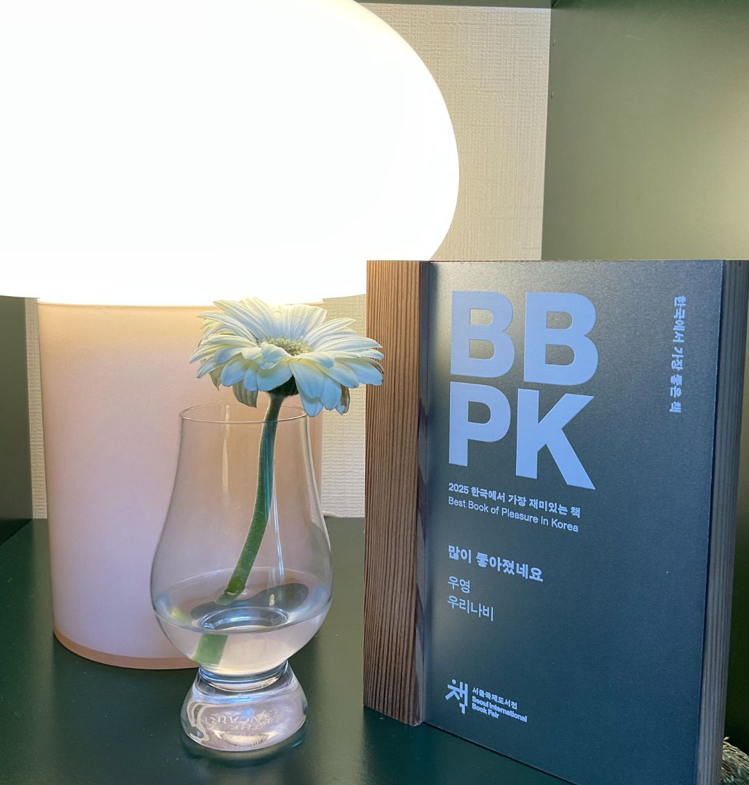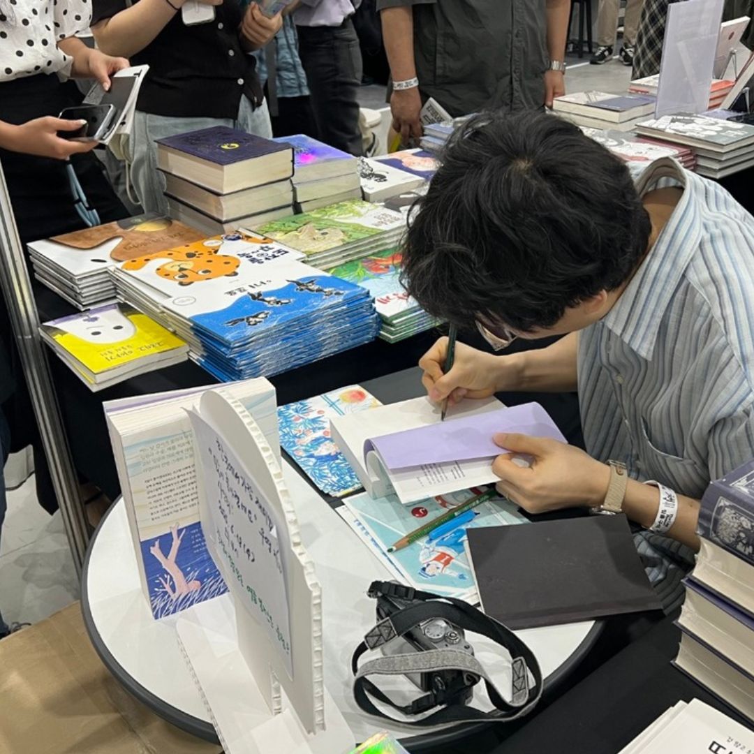 오후 4시, <우리나비> 출판사 부스 M34에 도착했다. 큼지막하게 인쇄된 현수막과 책들로 둘러싸인 작은 공간, 그 안에서 조용히 사인회를 열었다. 대형 출판사들이 쌓은 크고 화려한 성들을 지나 도착한 변방의 작은 천막들. 국제도서전의 성주들이 앞다투어 뽐내는 위세를 넘어, 외곽에는 소규모 출판사의 천막들로 이루어진 마을이 있다. 책 한 권의 크기는 평등한 거 같지만, 그것을 매대에 올리기 위한 기획과 디자인은 철저히 자본과 비례한다. 화려한 팝업 스토어와 굳즈를 자랑하는 분위기 너머, 책만으로 독자의 눈길을 사로잡기란 쉽지 않다. 그래도 골목을 누비며 새로운 책을 탐색하는 독자들이 있고, 내향적인 출판인들은 최대한의 용기로 설명을 이어가고, 책은 주인을 찾아간다. 조촐한 사인회에 일부러 찾아와 준 독자에게 주섬주섬 싸인과 가져온 일러스트를 건네드렸다. 고마운 일이다. |